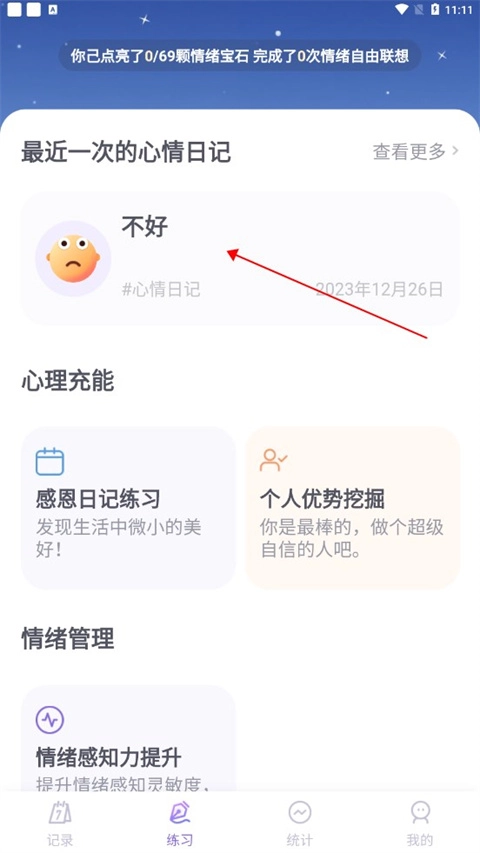 5、点击练习,然后点击自己的心情日记