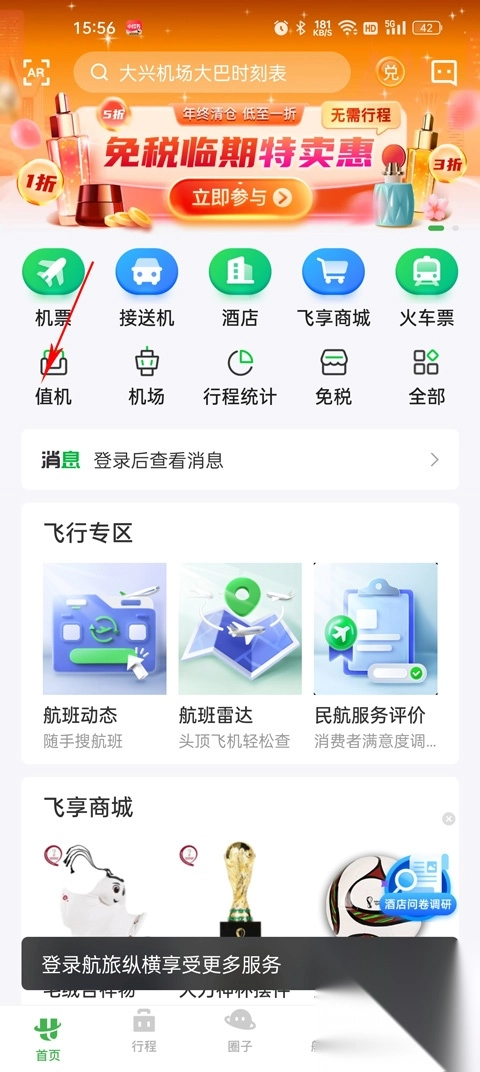 2、来到首页之后,点击首页功能界面中的值机进入页面;