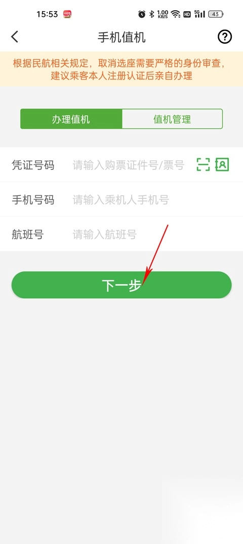 3、进入手机值机页面之后,填写凭证号码、手机号码、航班号,最后点击下一步,就可以进行快速选择想要的座位了。