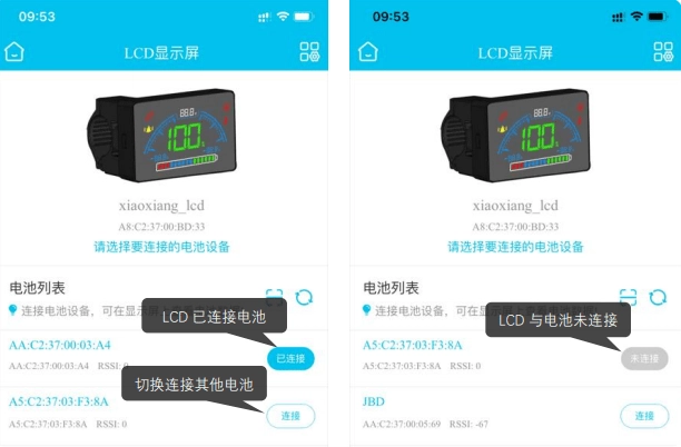 若要切换连接其他电池,直接在电池列表里选择其他电池,点击“连接”,就能完成切换。 STEP5:连接成功后,便可在LCD屏幕查看电池基本数据。