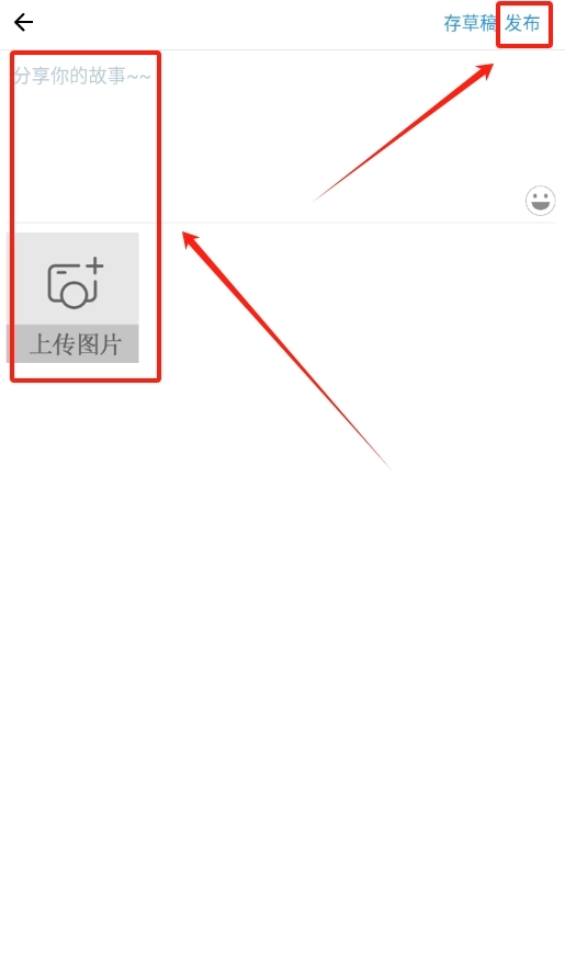 3、在编辑页面输入想分享的车生活故事,上传图片,确认后点击右上角 “发布” 即可。