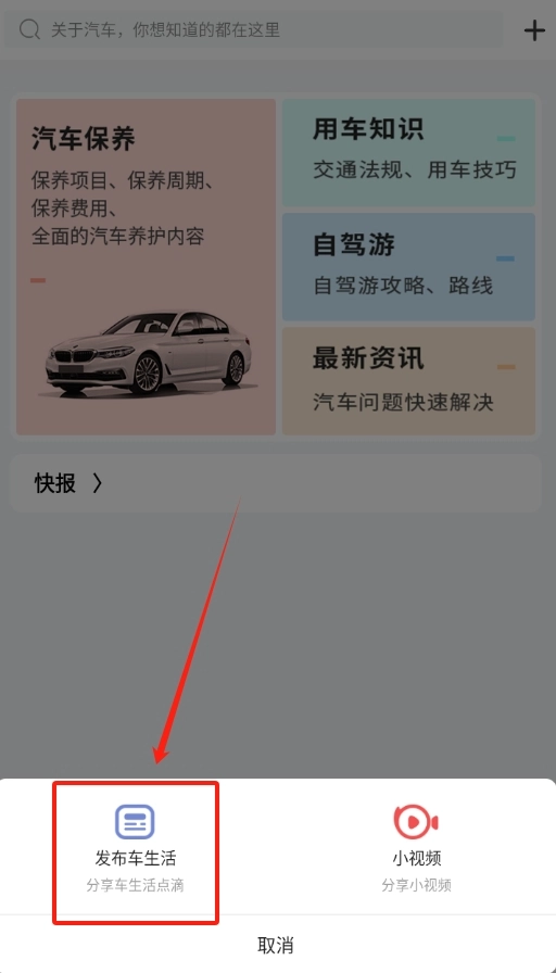 2. 点击加号,此时会弹出多个选项,从中找到“发布车生活”并点击,随即进入内容编辑页面。