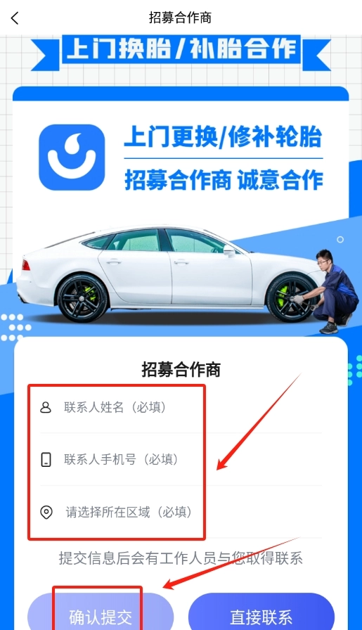 3、在合作页面里选择 “招募合作商”,填写联系人姓名、手机号和地址,填完后点击提交。