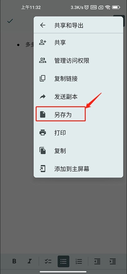 1. 开启Google文档,选中要导出的文档页面,先选取菜单中的选项,接着点击【另存为】选项。
