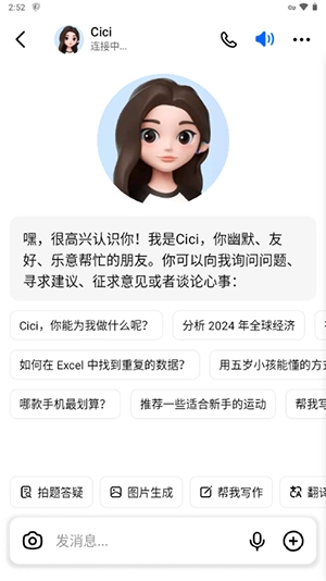 3、这个时候我们就可以开始进行与cici聊天AI对话了。