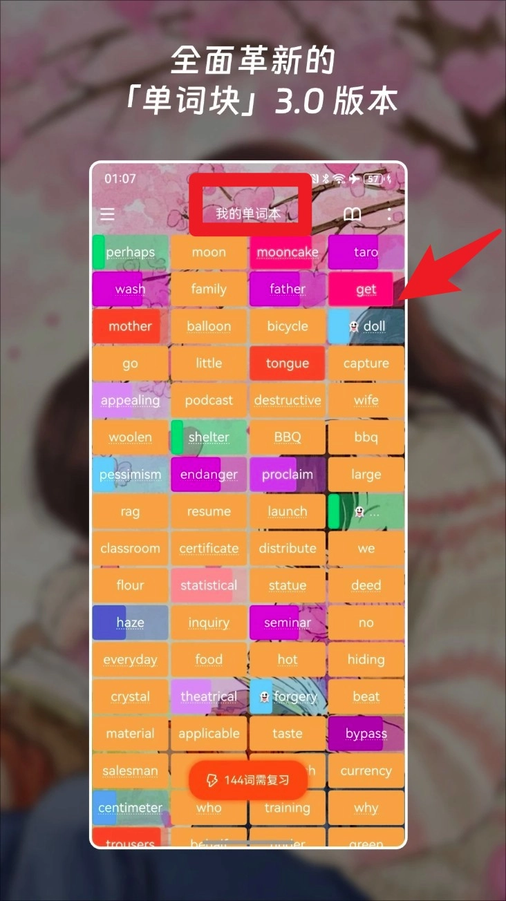2. 登录后点击「我的单词本」,在图块页面中滑动选择要背诵的单词,点击即可开始学习。