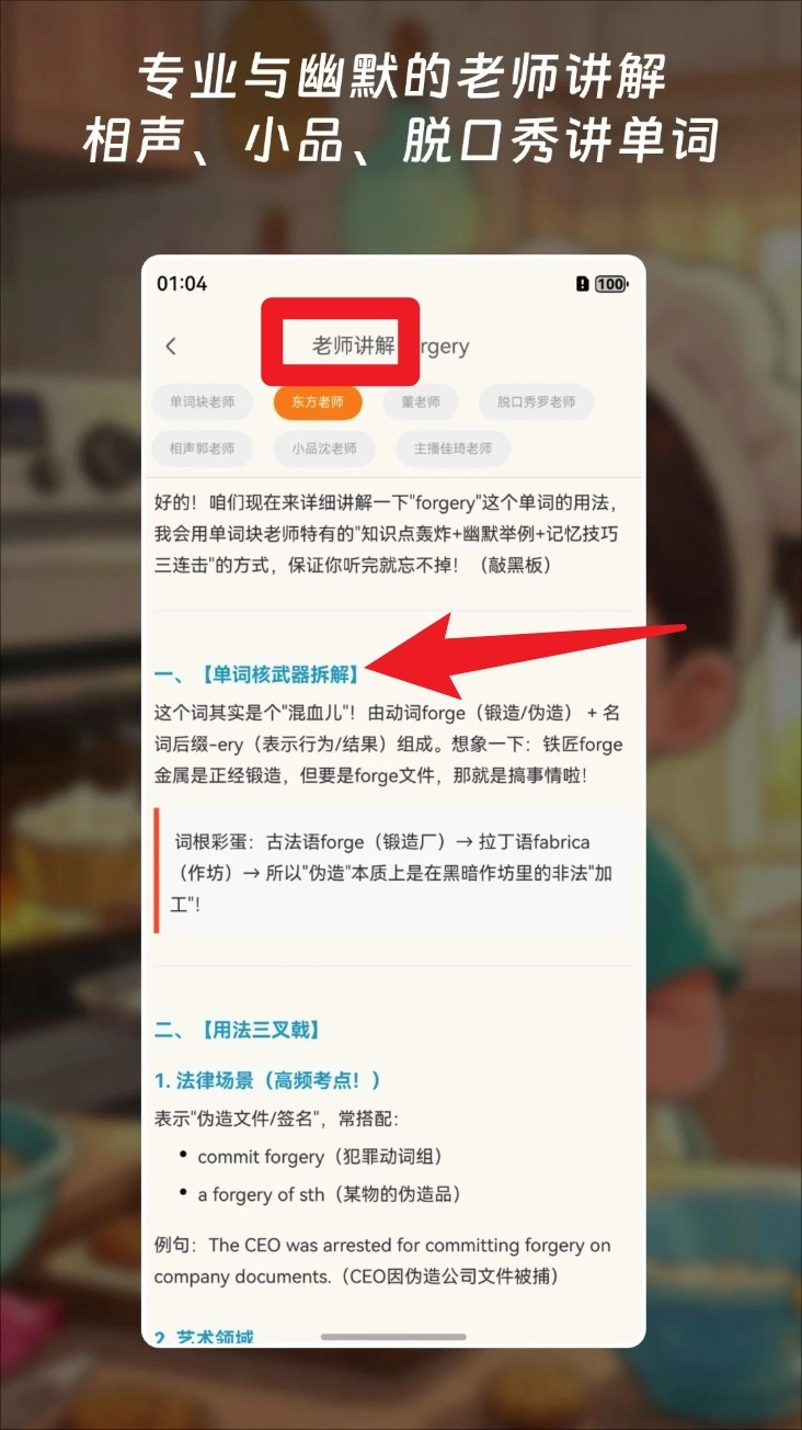 3. 点入单词详情后可查看「老师讲解」内容,包含词根拆解、用法举例与联想小品。