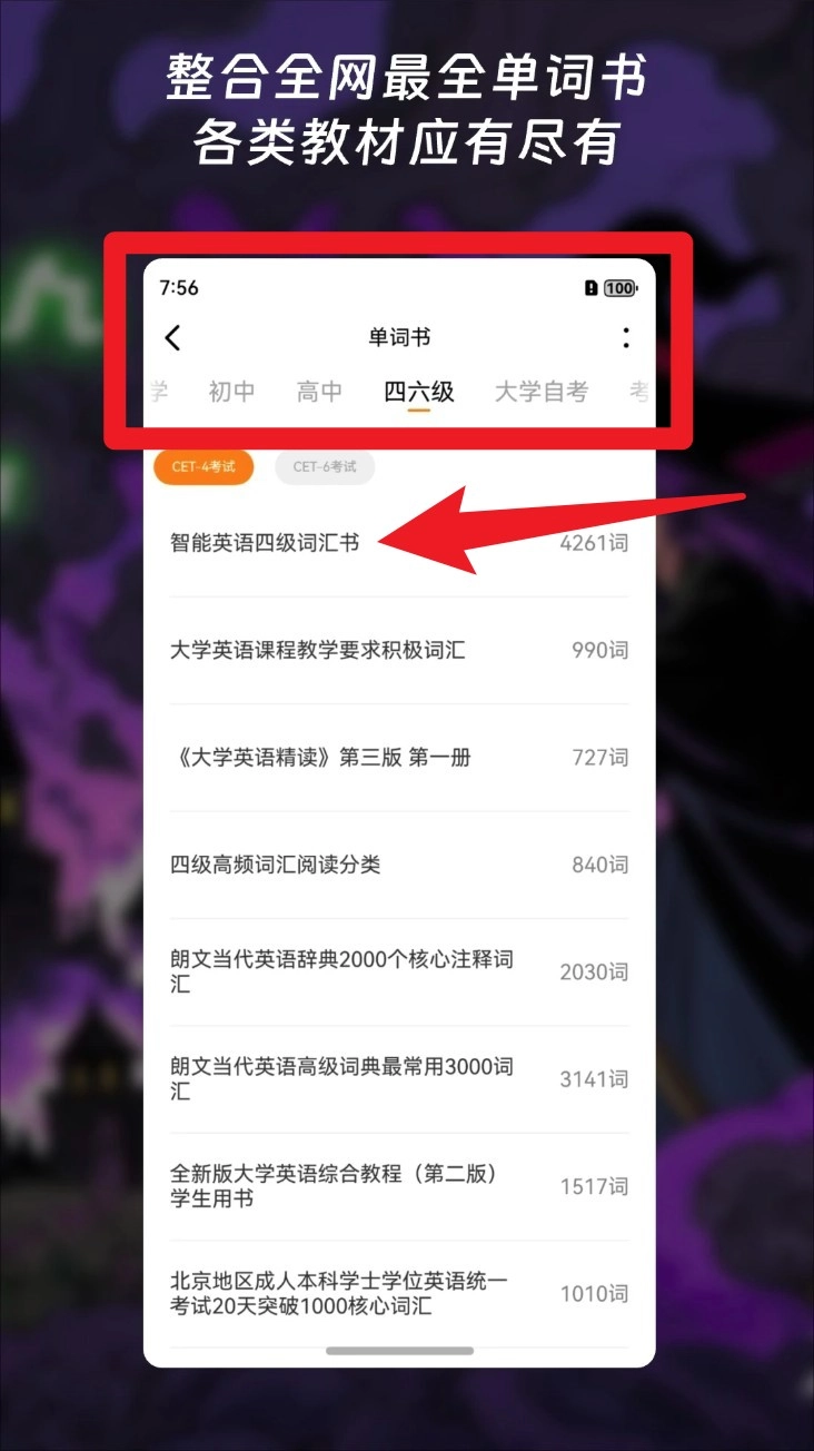 4. 切换到「单词书」分类页,可浏览四级、六级及各类教材词汇,自由选择词书开始记忆。