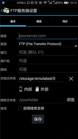 1. 启动AndFTP,映入眼帘的界面便是如此。随后,点击界面上方的加号“+”,依次填入你的域名、类型(我选用的是sftp)、账号以及密码 ,(其他设置暂时保持不变),接着点击“高级”。