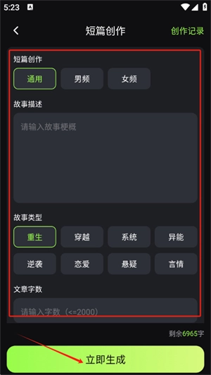 3、进入短篇创作服务,方法是点击该入口。进入后,输入故事梗概,挑选故事类型并设定字数,最后点击“立即生成”就可以了。