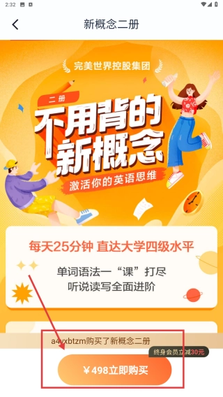 3、查看新概念二册课程介绍后,点击498立即购买按钮,完成课程购买流程。