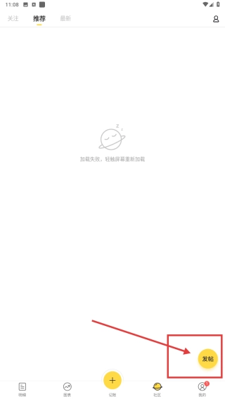 2、在推荐页,点击右下角发帖按钮,进入发帖页面,准备分享内容。