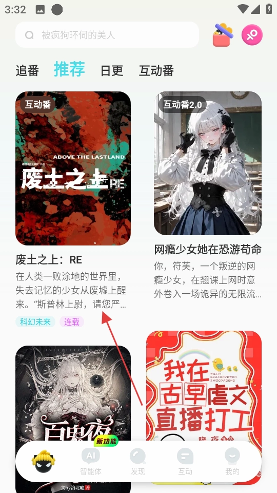 1、在推荐页找到感兴趣的作品,如废土之上,点击作品封面可进入阅读。