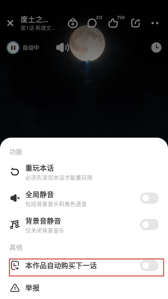 3、在功能菜单里,可按需开启或关闭本作品自动购买下一话功能。
