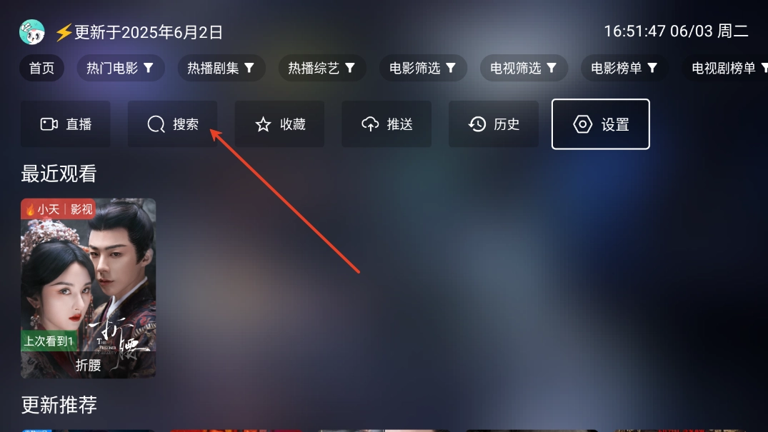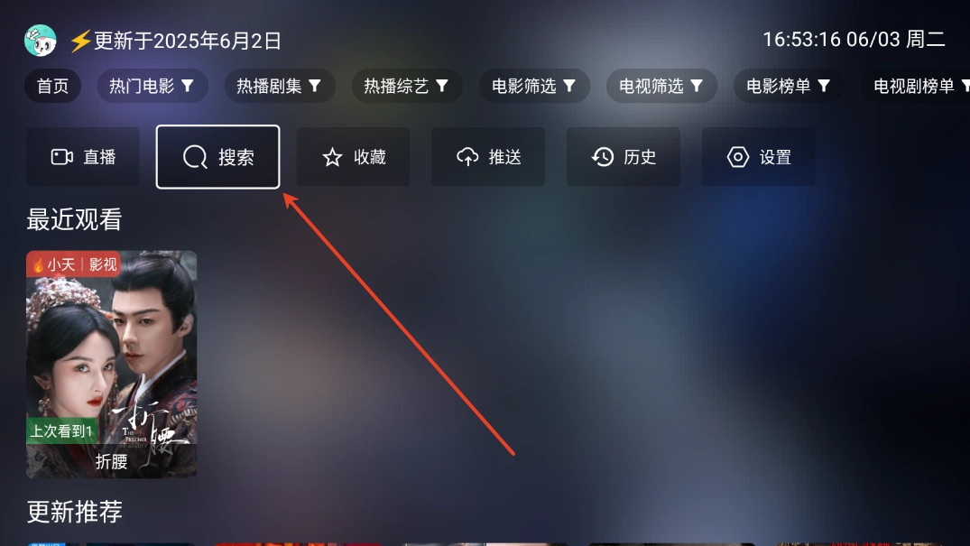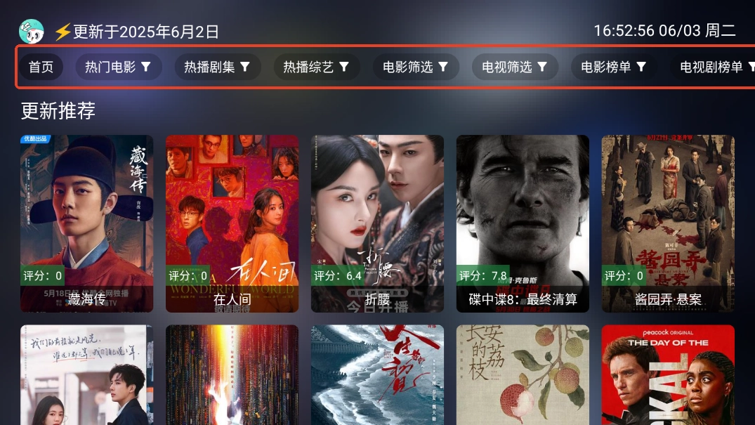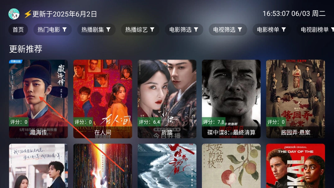 1. 开启前线影视TV,进入应用界面,映入眼帘的便是首页,其上设有热门电影、电视剧、综艺等内容分类。