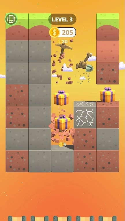 2. 地层中所埋藏的,不只有常见矿物,还存在随机出现的道具,像是加速buff或者稀有宝石,为挖掘过程增添了未知的乐趣。