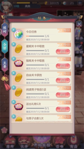 5、日常任务:每日有三个,完成后可获取小判、七彩雫、月之光辉中的几种,其中月之光辉至少固定获得一次。