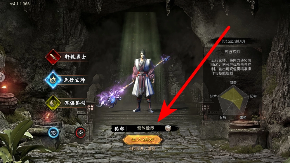 1. 在初始界面,玩家能够从轩辕勇士、五行玄师、傀儡祭司等多种不同职业中挑选。每个职业皆具备独特之处。当玩家选好职业并设定好昵称后,点击“进入游戏”按钮,即可开启冒险之旅。