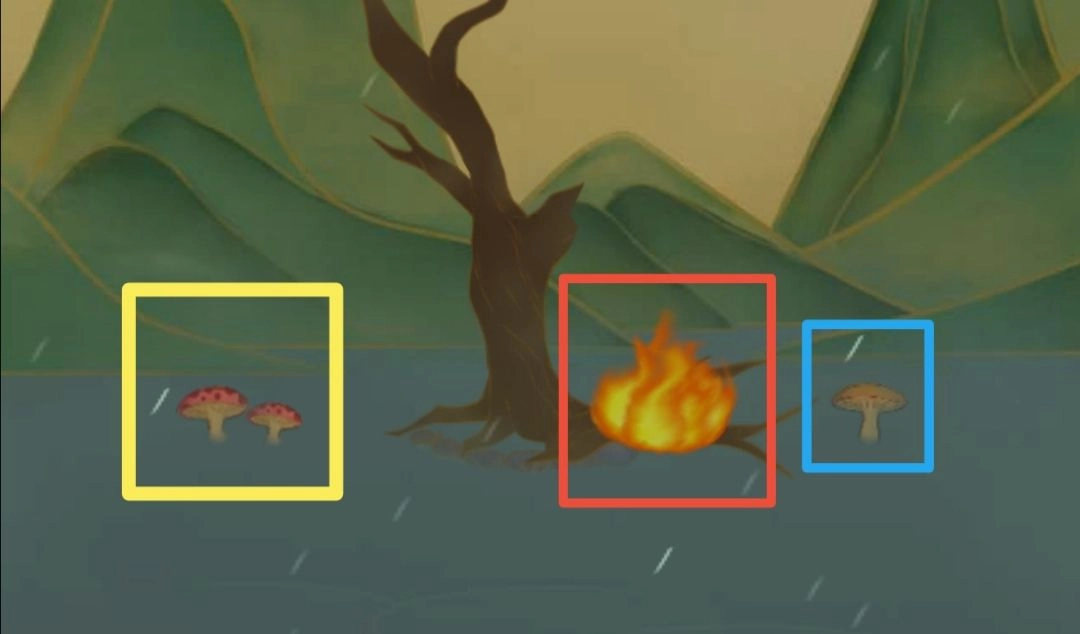 成就二:稍等片刻,着火啦。点击蓝色区域内的蘑菇,把蘑菇拿到红色区域烘烤,之后拿给木兰食用。