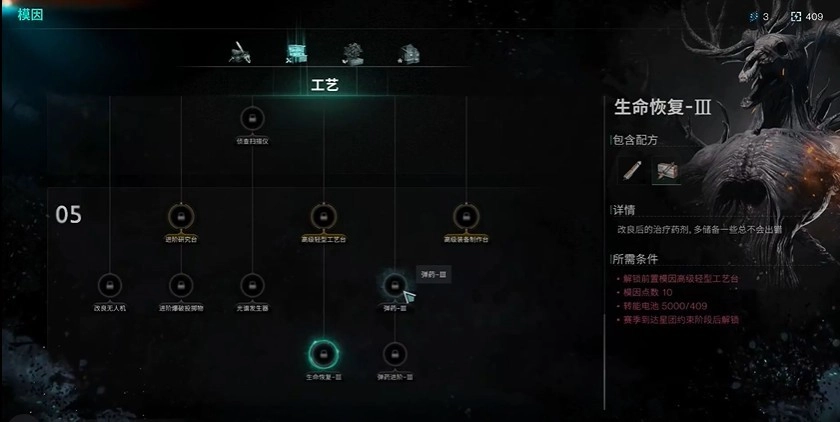 2、工艺类别:研究台、工艺台以及制作台的技能必须全部点满,这样才能从容应对复杂的制造流程。对于热衷于PVP的玩家而言,改良无人机和光谱发射器这两项一定要点满。弹药相关的内容也要全部拉满,而生命恢复方面,则可根据实际情况进行选择。