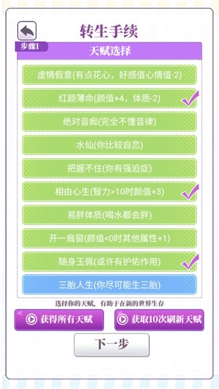 2、点击“下一步”,选择初始属性。合理分配属性至关重要,举例来说,若你的体能数值极低,那么在后续的人生进程中,便极易生病乃至死亡。