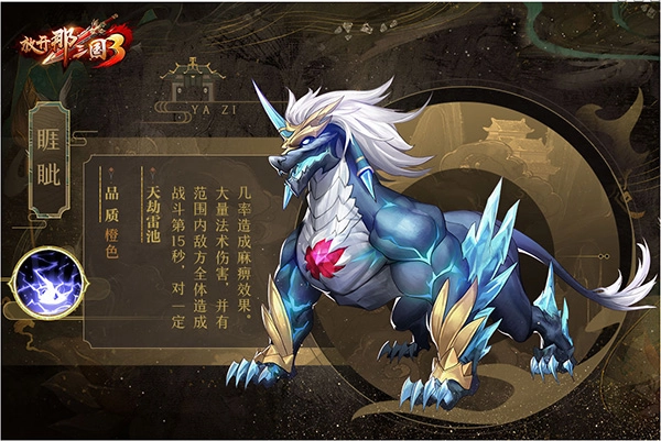 3、技能简评:睚眦身为钟山神的上级,其技能拥有全体伤害能力,并且还有一定几率触发麻痹效果,在战斗中同时具备输出与控制的双重作用。