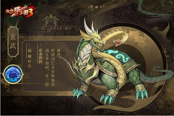 3、技能简评:玄武所具备的技能,可在开场之际,大幅增强我方全体武将的生存能力,有效防止开场便被敌方迅速秒杀,从而为我方武将争取输出机会以及积攒怒气的时间。