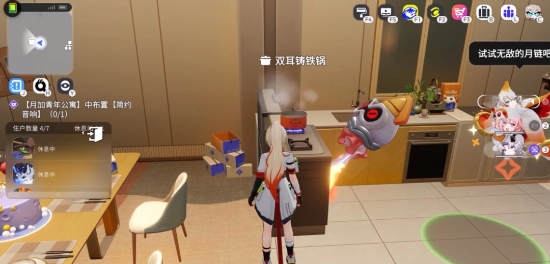 月灵的“打工”与“互动”,进一步加深了玩家与这座都市之间的联系。开饭之时,你会瞧见“月灵员工”们从四面八方争前恐后地飞奔而来。在玩家自己的居所里,前文提及的那个可用于载具加速的喷射鱿,还能用来做饭“生火”,营造出十足的生活氛围感。