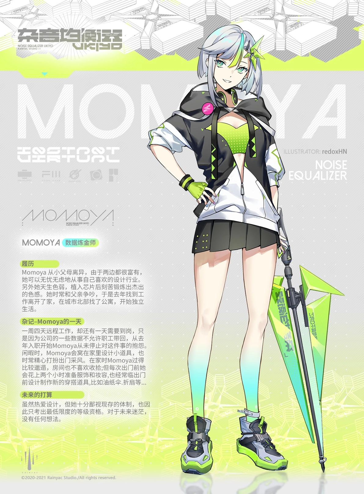 Momoya自幼父母便离异了,好在双方家庭皆颇为富有,这使得她能够毫无后顾之忧地投身于自己钟爱的设计领域。Momoya天生患有色弱,不过在植入芯片后,凭借着自身的刻苦锻炼,培养出了出众的色感。她和父亲时常发生争吵,因此在去年找到工作后,便毅然离开家,在城市北部寻觅到一处公寓,就此开启了独立生活的新篇章。