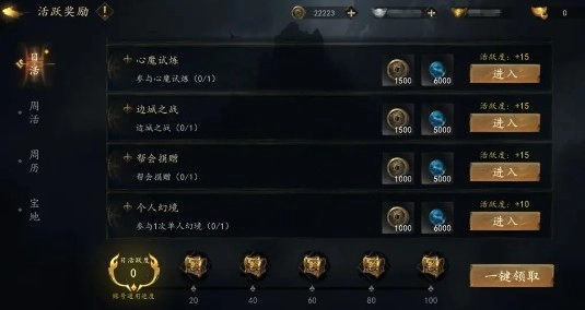 达成每日活跃任务,就能获取丰厚的经验、铜钱以及绑定元宝。