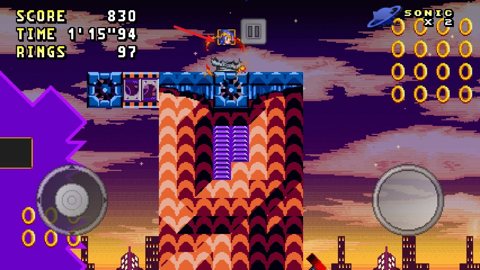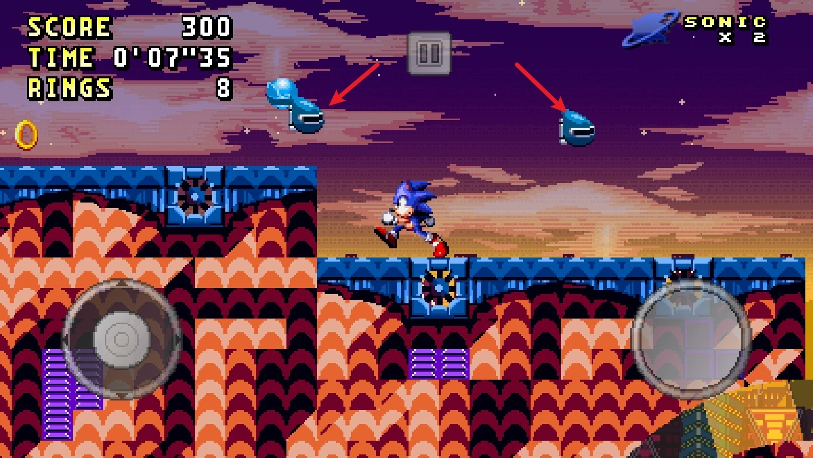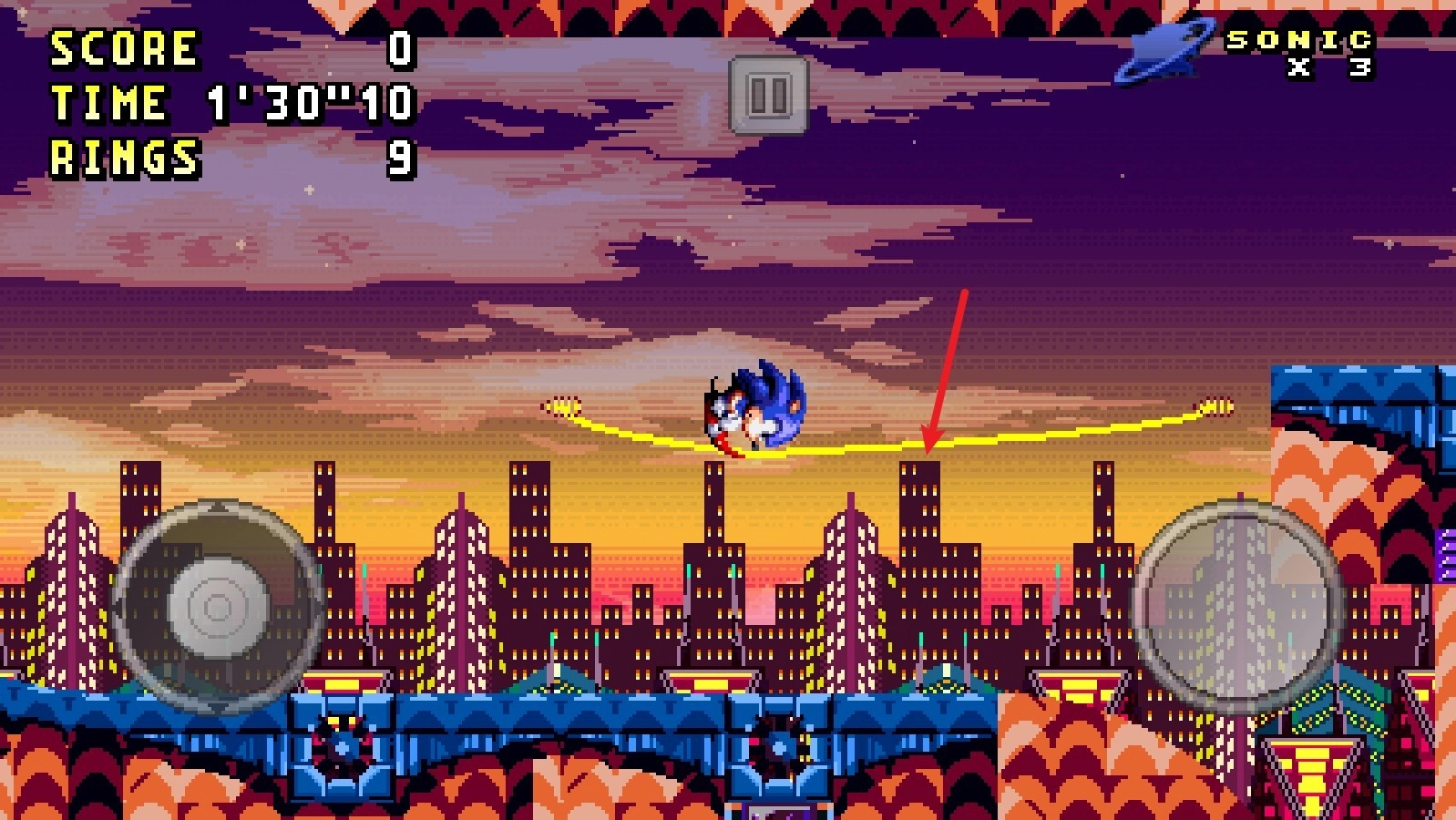 2、通过右侧的按钮能够操控索尼克实现跳跃动作,若长按此按钮,索尼克会跳得更高一些。