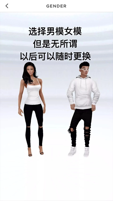 3、完成注册后,需要选择男模或女模,但这并非固定不变,之后可随时在更衣室进行更换。此处所选的人物模型仅决定您首次进入游戏时的性别,点击相应人物即完成选择。