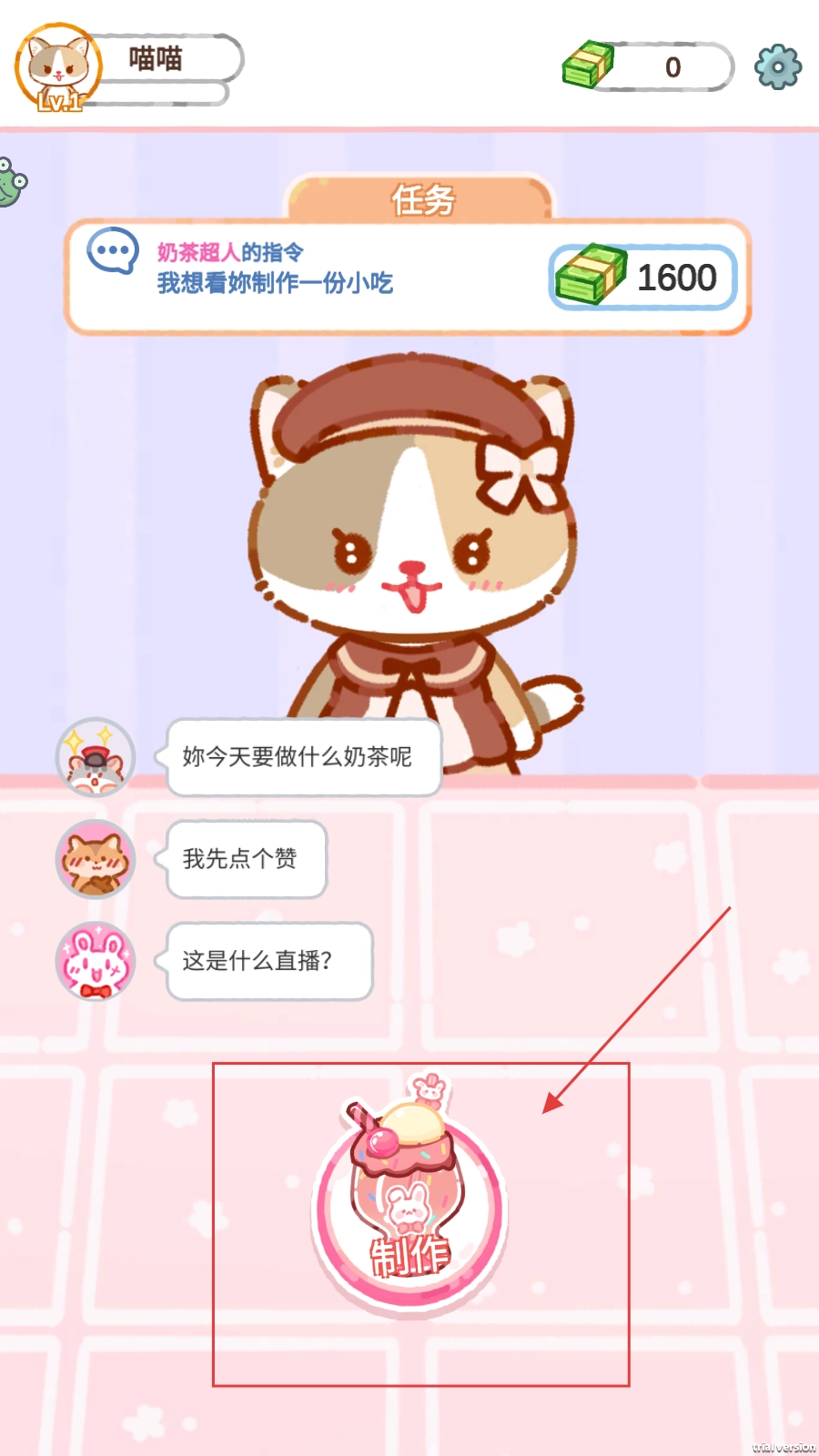 1、领取【奶茶超人的指令】任务后,点击下方【制作】按键启动奶茶制作流程。