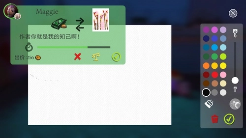 2、玩家需借助右边的画板,在白纸上创作自己的作品,完成后进行售卖。只要所画作品能获得NPC的青睐,他们便会依据喜好程度,以不同价格购买画作。