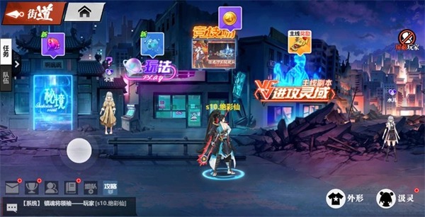 进入街道界面,你能看到其他玩家、一些NPC,还有主要的玩法入口,分别为主线玩法“进攻灵域”、秘境入口、竞技场,以及其他玩法入口。以下是小编整理的入口对应玩法表。