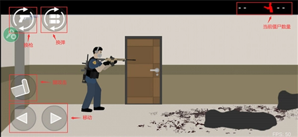 4、左下角负责左右移动,其上方一点为腿攻击操作区域,左上角用于换枪,紧挨着它的位置是换弹区域。