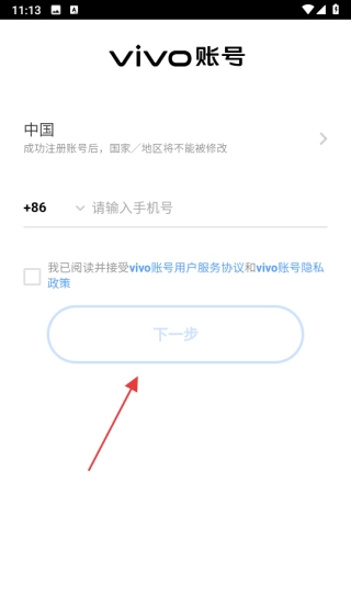1、于【vivo账号】注册页面,填写手机号,勾选协议,点击【下一步】,以推进注册流程。