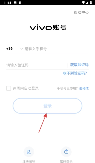 2、【vivo账号】登录页,填手机号-获验证码-输后点【登录】,完成登录。