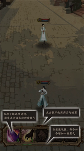 3、在场景的下方,陈列着角色的各类武学技能。每当进入一个攻击回合,聚气便会增加一格。