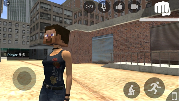 4、进入游戏后,可先点击【chat】进行对话。游戏操作方面,左边的圆圈用于前进或后退,右边的则是控制蹲下与跳跃。