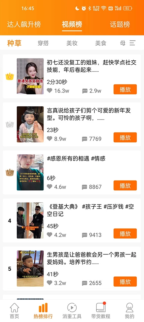 具备达人飙升榜、视频榜、话题榜等各类热榜排名的详尽分析。