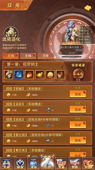 在征战页面,玩家点击左下方的任务,即可进入任务页面,领取已完成任务的奖励。这里设有主线、支线、日常三个任务板块可供完成。
