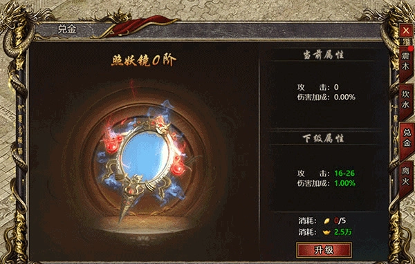 兑金所对应的仙宝为照妖镜,其对应的加成属性为攻击力,能够提升伤害加成。升阶所需材料为兑金精华与绑定元宝。