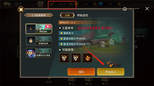 4、每进入一个冒险关卡,都要消耗5点体力值,体力值的上限是100。