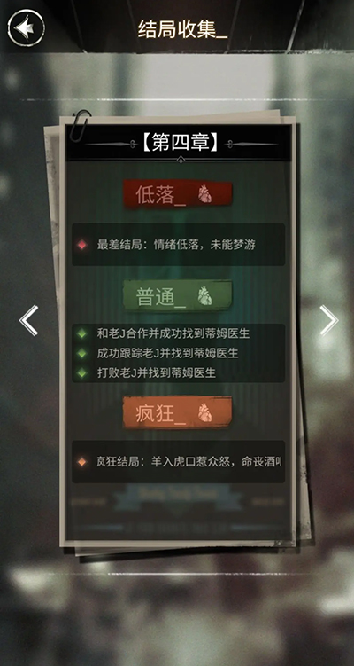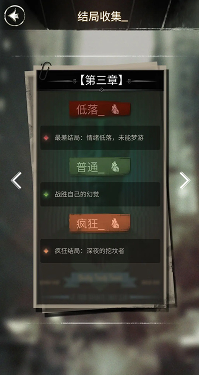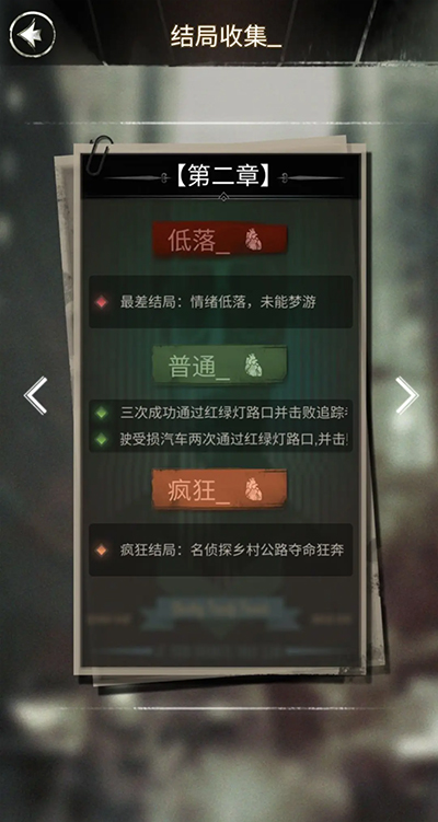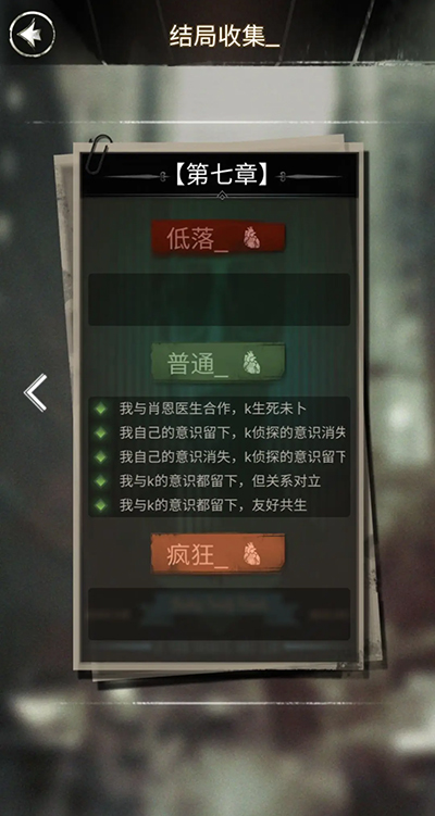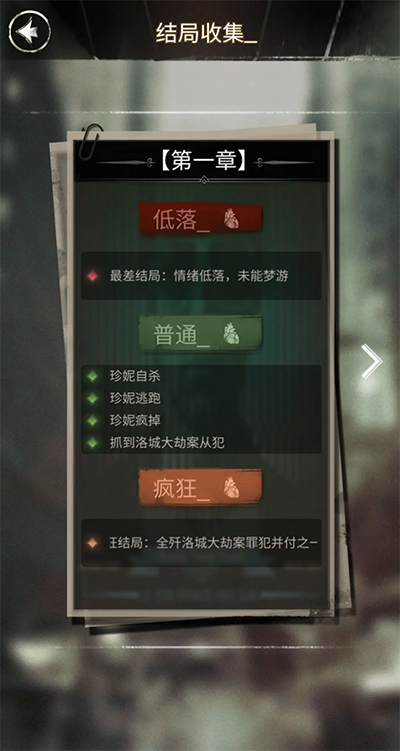 探魇,这款独具特色的文字剧情解谜游戏,有着多元化的开放结局设定。在游戏中,玩家将化身侦探K,通过解读剧情文字,做出属于自己的判断。其玩法烧脑,形式新颖,堪称一款极具价值的侦探破案游戏。那么,游戏里究竟总共包含多少个结局呢?接下来就由小编为大家详细介绍。游戏中每个章节的结局,若依据情绪值来划分,总计有三种,分别为低落、普通以及疯狂。并且,这三种结局各自又衍生出不同的开放结局。