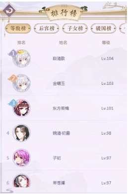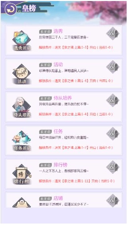 13、排行榜(通关灵境关卡1-11开启):排行榜中包含了等级榜、后宫榜、子女榜、破国榜、侍从榜、战力榜、风流榜几个方面,如果陛下在某方面足够厉害的话,名字会显示在排行榜上,被全区的玩家看到哦~所以赶紧努力走上人生巅峰吧!