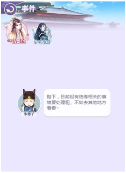 11、事件(通关灵境关卡2-9开启):事件中包含了皇子出仕结缘相关事件和后宫事件等等,及时通知陛下宫中大大小小事宜,成为陛下管理后宫的好助手。