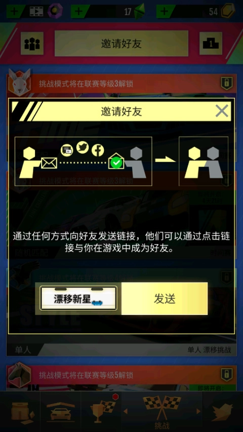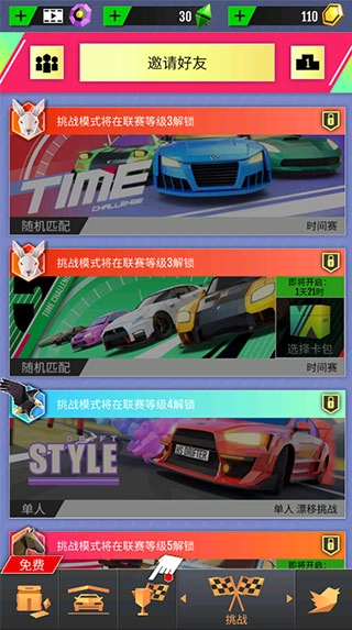 1、打开绝尘漂移最新版,点击挑战,点击上方邀请好友;