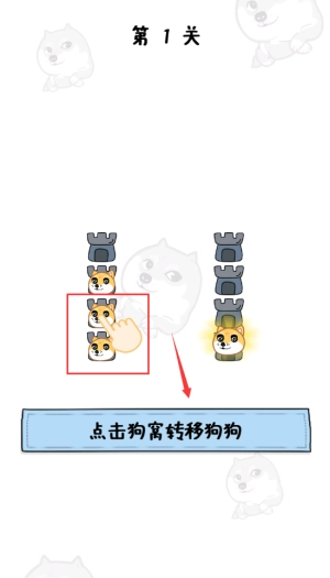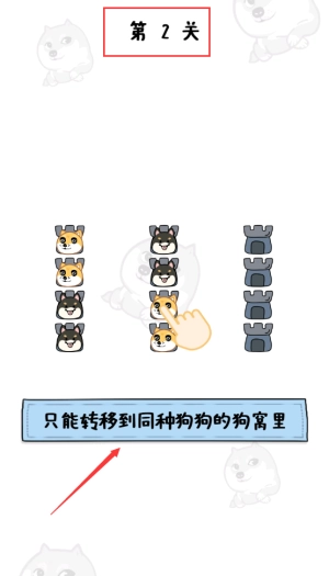 3、拖动中间狗到同种狗窝,遵守规则过关。
