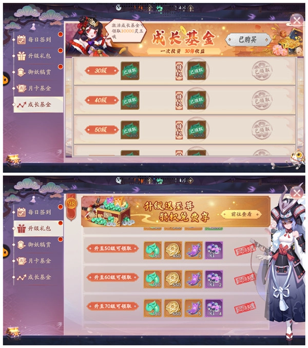1、成长基金与升级礼包,均在角色达到特定等级时,会给予一定数量的灵玉作为奖励。